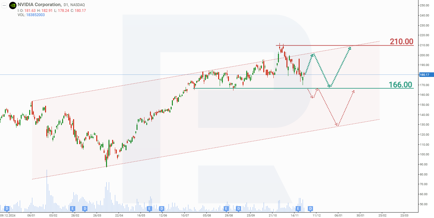 Базалық сценарий NVIDIA акцияларының шамамен 200 АҚШ доллары деңгейіндегі қарсылық аймағына дейін өсуін, содан кейін 166 АҚШ доллары маңындағы қолдау деңгейіне қысқа мерзімді түзетуді болжайды. Компанияның ауқымды кері сатып алу бағдарламасын, AI жүйелеріне арналған чиптерді жеткізу бойынша ұзақ мерзімді келісімшарттарын және нарықтағы жетекші позициясын ескерсек, NVIDIA акцияларына инвесторлық қызығушылықтың жоғары деңгейде қалуы күтіледі. Сәйкесінше, 166 АҚШ доллары деңгейіндегі қолдаудан серпілу 210 АҚШ долларына дейін жаңартылған өсімге алып келуі мүмкін.