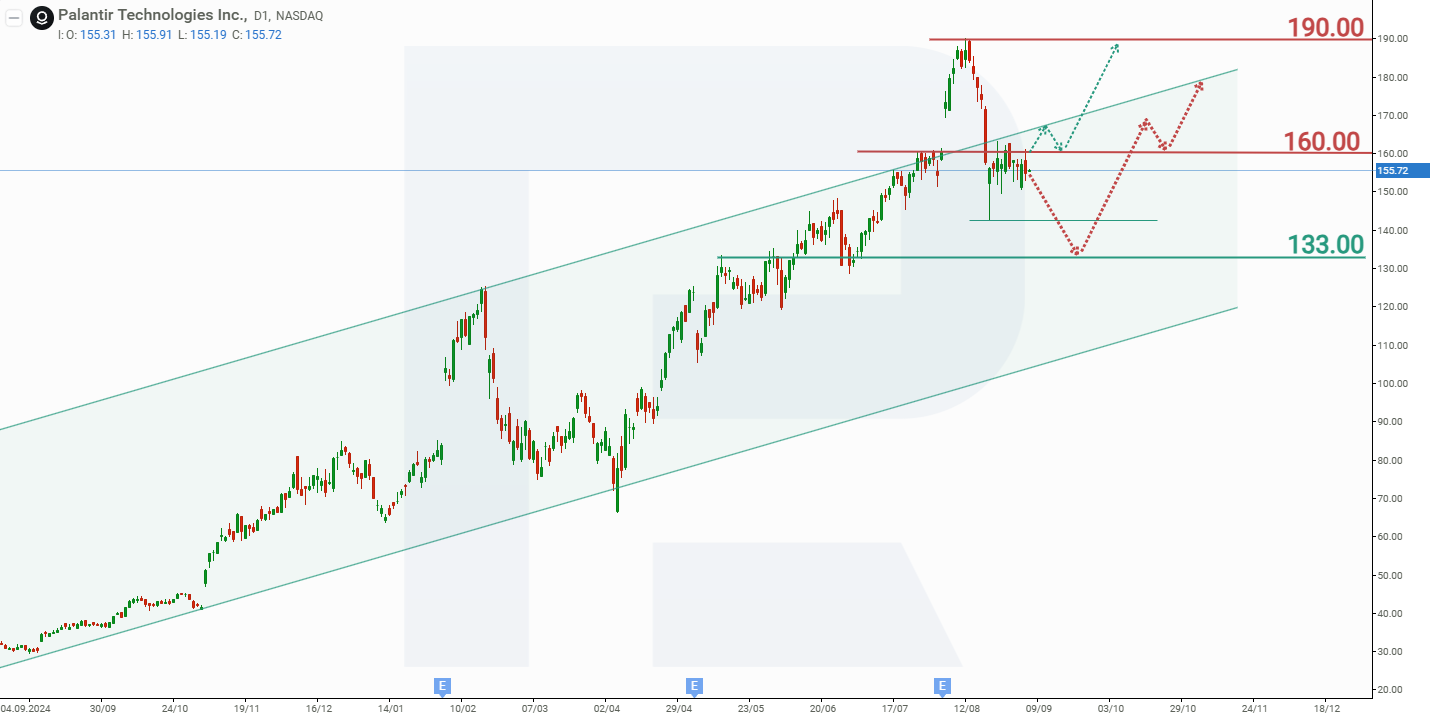 Негізгі сценарий Palantir Technologies акцияларының PLTR бағасының шамамен 133 АҚШ доллары деңгейіндегі жақын қолдау деңгейіне қарай әрі қарай төмендеуін болжайды. Осы деңгейде акцияларға инвестициялау инвесторларға тартымдырақ көрінуі мүмкін, бұл сатып алу қызығушылығын ынталандыруы ықтимал. Одан кейін қолдаудан серпілу және өсуші арнаның жоғарғы шекарасына – 180 АҚШ долларына қарай бағаның қайта өсуі күтіледі.