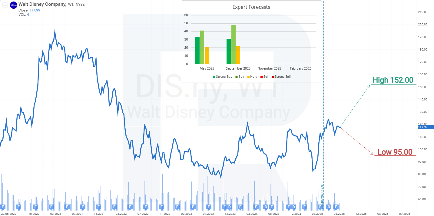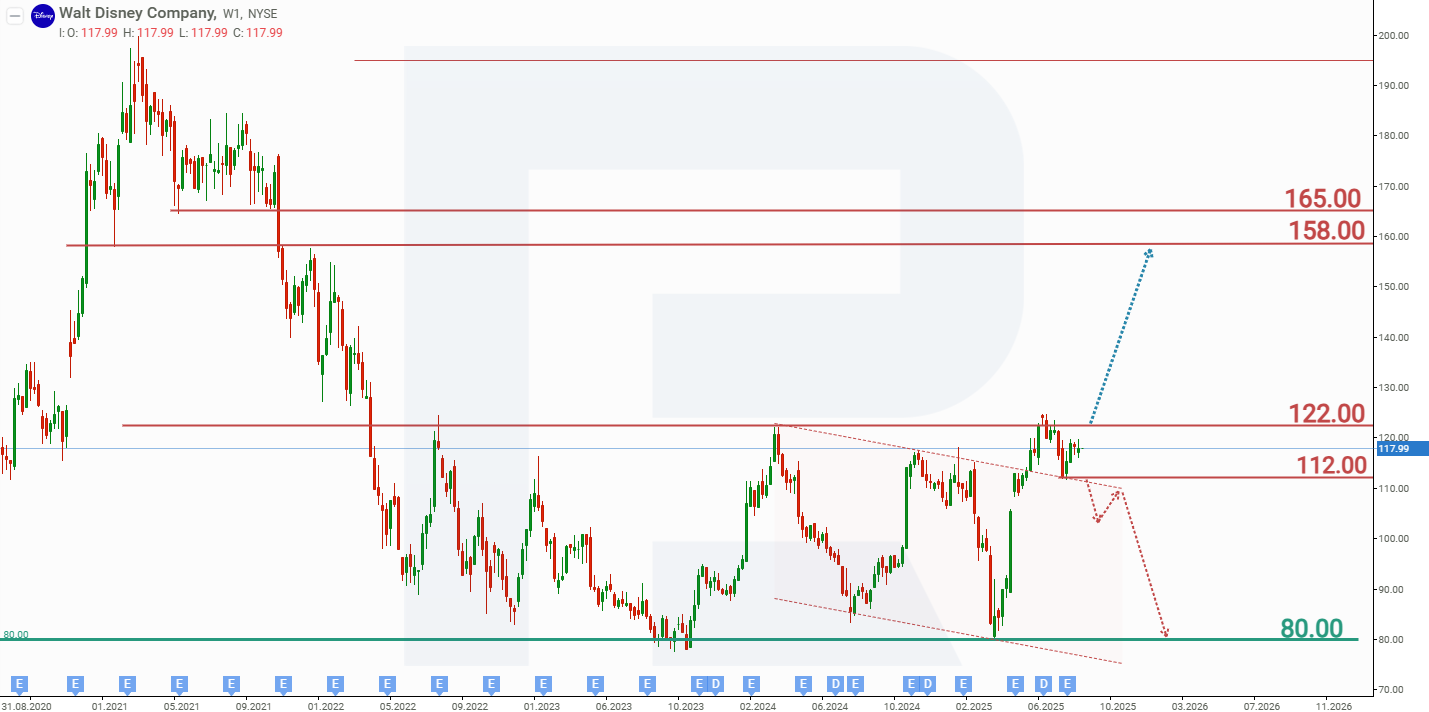 2025 жылдың қыркүйегі жағдайы бойынша DIS 80 мен 122 USD диапазонында саудалануда. Маусымда осы диапазонның жоғарғы шекарасын бұзу әрекеті болды, бірақ қарсылықтан өтуге сұраныс жеткіліксіз еді. Q3 FY2025 нәтижелері инвесторлар тарапынан негативті қабылданып, DIS акцияларының төмендеуіне әкелді. Алайда жиырма күн ішінде бұл негатив толық сіңіріліп, акциялар қайтадан 122 USD маңындағы қарсылық аймағына жақындады. Walt Disney Company акцияларының динамикасына сүйене отырып, 2025 жылға екі ықтимал болжамды бөліп көрсетуге болады: