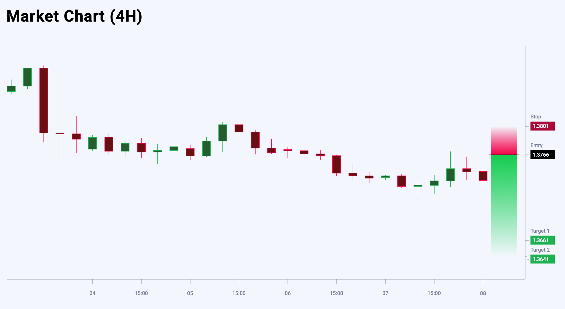 USDCAD валюталық жұбы 1.3755 қолдау деңгейінің астында қалып отыр. Қысқа мерзімді тренд аюлы болып қалады. Аралас, бірақ жалпы алғанда аюлы сигналдар диапазондық сауда мен бүйірлік қозғалысқа әкелді. Уақытша жоғары түзету күтілуде; дегенмен, күндік индикаторлар әлі де әлсіз аюлы көңіл-күйді көрсетеді. Сауда көлемдерінің азаюы нарық белсенділігінің төмендегенін білдіреді. Бүгінгі USDCAD сауда идеясы Sell Limit күтілетін ордерді орналастыруды ұсынады.
