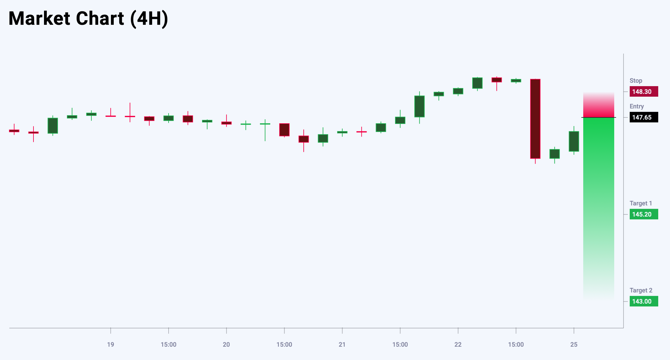 USDJPY жұбы 16 сессия бойы бүйірлік диапазонда қалып отыр. Күндік графикте аюлы Outside Day үлгісі пайда болды, бұл әдетте бұқалық трендтің аяқталып, жаңа төмендеу қозғалысының басталуын білдіреді. Азия сессиясында сатып алу белсенділігі байқалды. Қарсылық деңгейі — 147.65. Ашылу кезінде қалыпты қалпына келу мүмкін, бірақ өсу әлеуеті шектеулі. Бүгінгі USDJPY сауда идеясы күтілетін Sell Limit бұйрығын қоюды ұсынады.