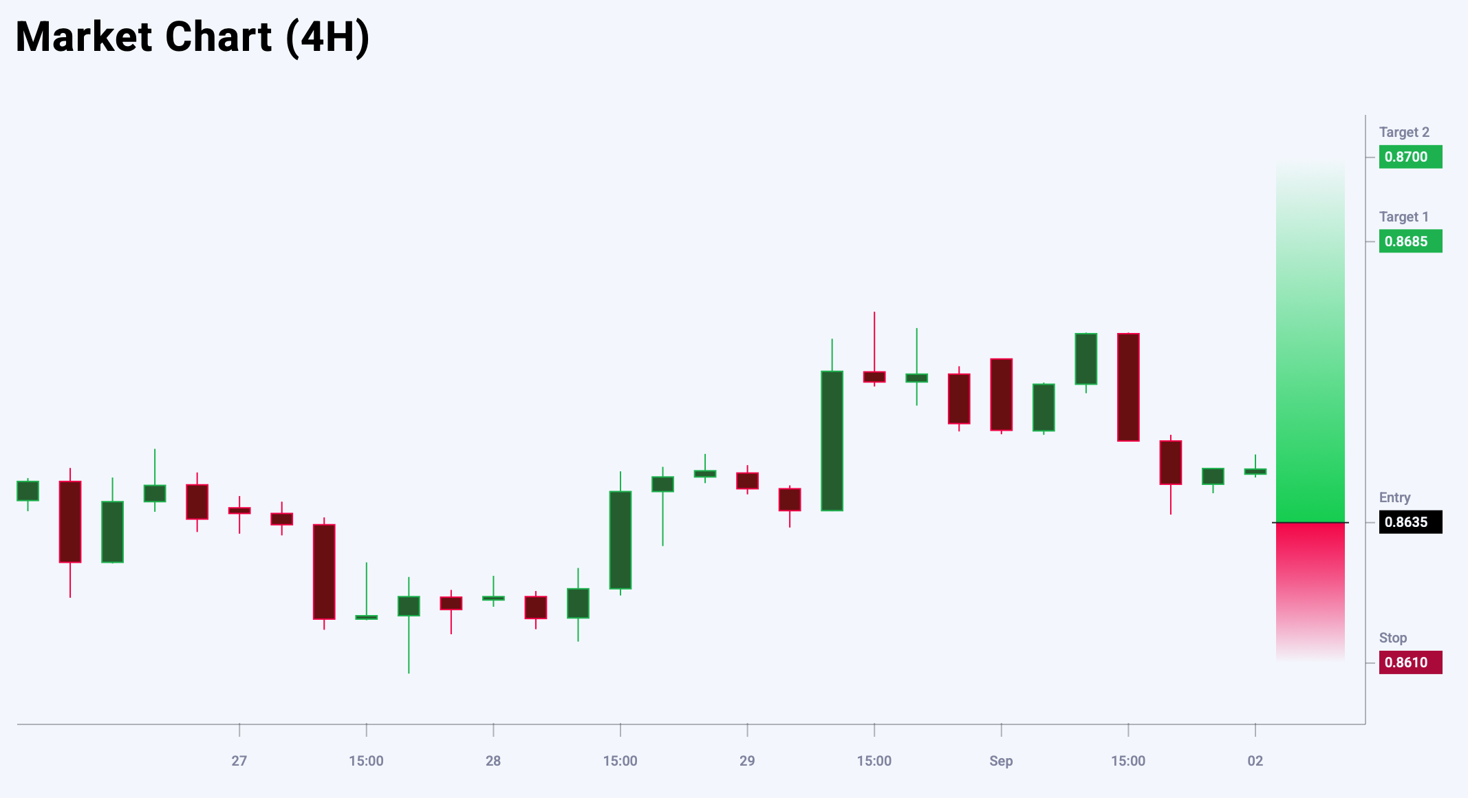 EURGBP бағамы белгісіздікте қалып отыр, ішкі күндік графикте бүйірлік консолидация жасап, белсенді түрде қарсылықты тестілеуде. Ағымдағы деңгейлерден сатып алу тәуекел/пайда арақатынасының қолайсыздығына ие. 0.8675 қарсылық деңгейінен жоғары бұзылу бұқалық импульсті растайды, мақсатты деңгей — 0.8700. Бүгінгі EURGBP сауда идеясы күтілетін Buy Limit бұйрығын қоюды ұсынады.