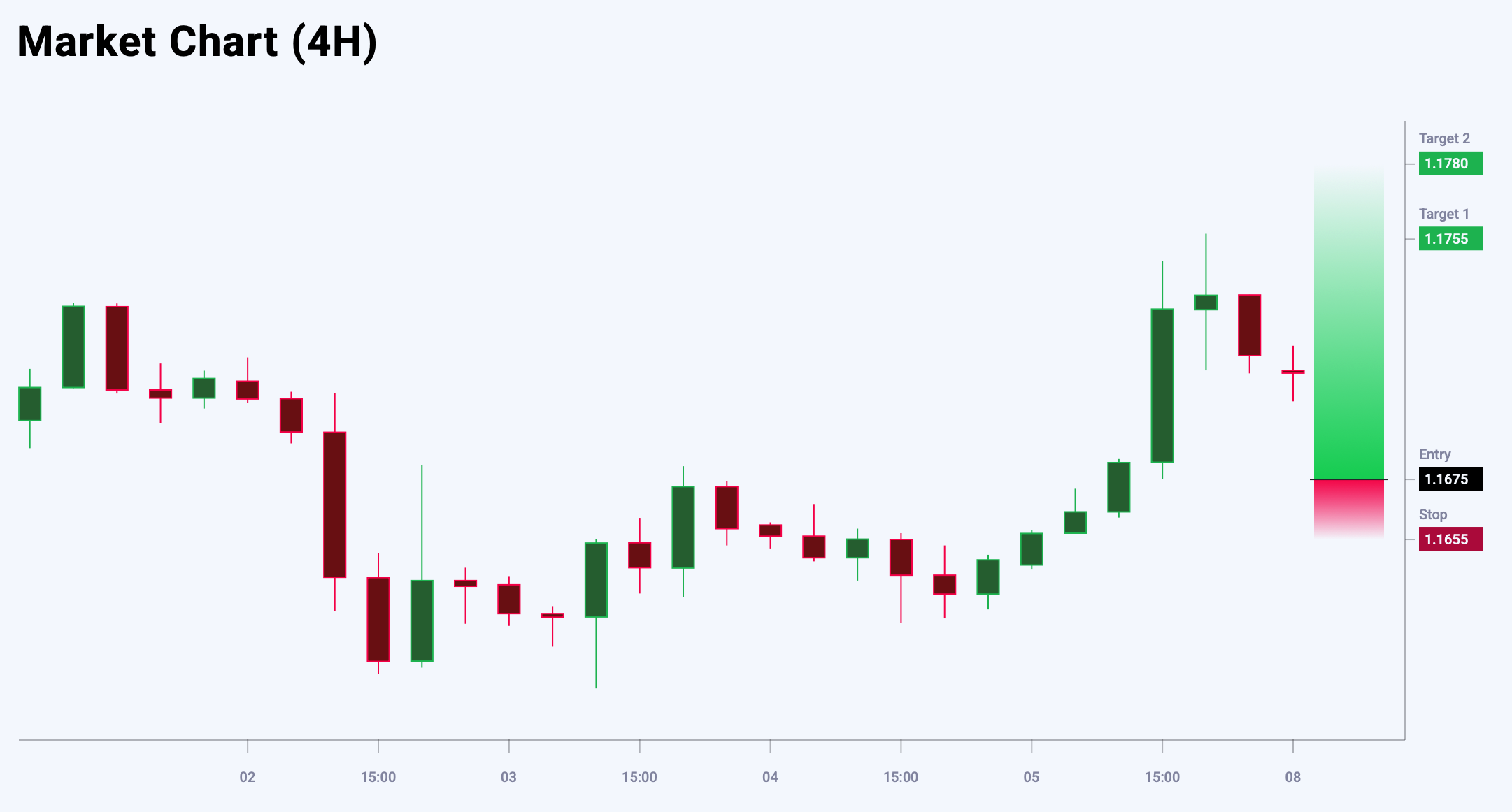 EURUSD жұбы бойынша жалпы тренд бұқалық болып қалуда, дегенмен қысқа мерзімді RSI төмендеуде. Түзетуші төмендеу күтіледі, баға Fibonacci түзету деңгейлерін сынайды. Қолдау 1.1675 деңгейінде орналасқан, сондықтан төмендеулерден сатып алу стратегиясы басым. Бүгінгі EURUSD сауда идеясы күтілетін Buy Limit бұйрығын қоюды ұсынады.