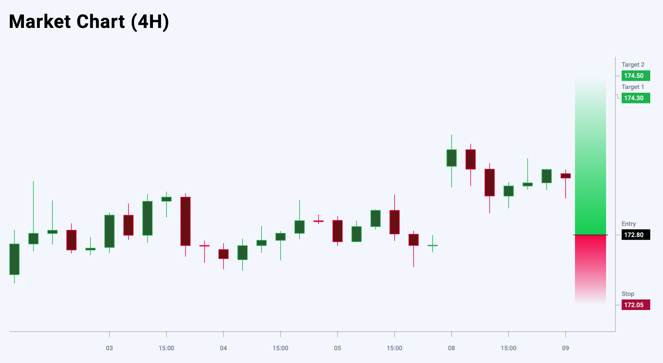 EURJPY жұбы қазірге дейін өсу қозғалысын аяқтағанына айқын белгі жоқ. Бұқалық көңіл-күй сақталғанымен, төмендеу әлеуеті бар аюлы түзету орын алуы мүмкін, бірақ ол ұзақ мерзімді трендті бұзбайды. Ағымдағы деңгейлерден ұзын позицияларға кіру тәуекел/пайда арақатынасына байланысты тиімсіз. 173.50 деңгейінен жоғары серпіліс бұқалық импульстің жаңаруын растайды, ал келесі мақсат – 174.50. Бүгінгі EURJPY сауда идеясы Buy Limit күтілетін ордерді қоюды ұсынады.