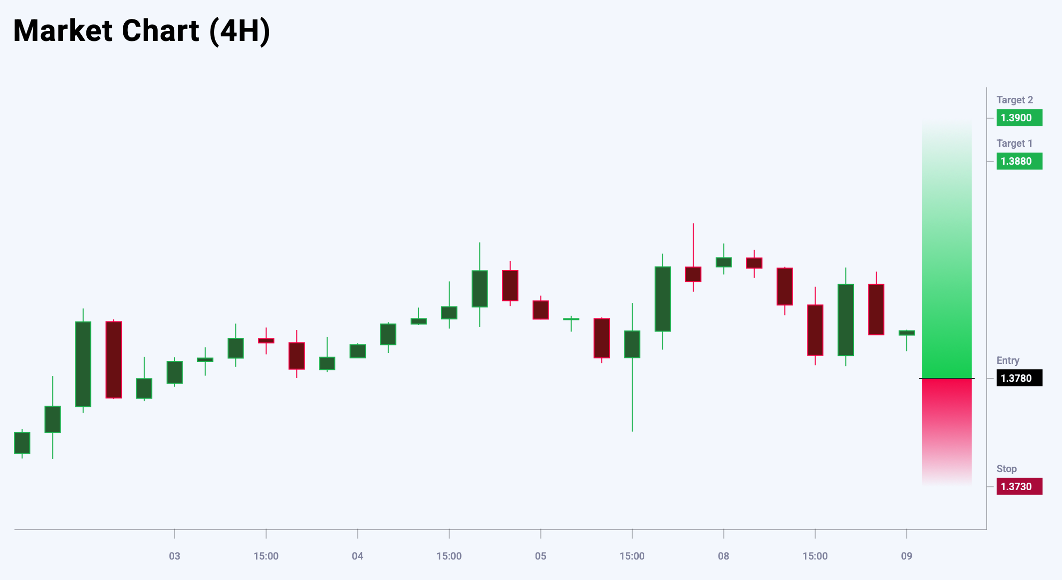 USDCAD жұбы қазірге дейін трендтің өзгергеніне айқын белгі көрсетпейді. Аюлы түзету қаупі сақталғанымен, RSI 50 маңында, бұл орта мерзімді күшті трендтің жоқтығын меңзейді. 1.3825 деңгейінен жоғары серпіліс бұқалық импульстің қайта жалғасуын растайды, келесі мақсат – 1.3900. Бүгінгі USDCAD сауда идеясы Buy Limit күтілетін ордерді қоюды ұсынады.