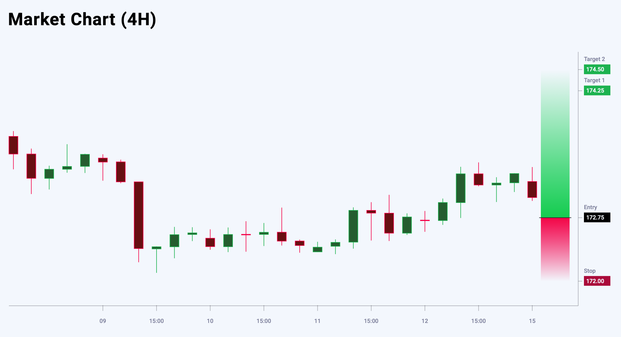 EURJPY жұбы бүйірлік консолидация аясында саудалануды жалғастыруда, нарықтық көрініс белгісіз болып отыр. Негізгі қолдау деңгейі – 172.25. Ағымдағы деңгейлерде ұзын позиция ашу үшін тәуекел/пайда арақатынасы қолайсыз. 173.25 деңгейінен жоғары серпіліс бұқалық импульсті растайды, ал мақсат – 174.50. Бүгінгі EURJPY сауда идеясы Buy Limit күтілетін ордерді қоюды ұсынады.