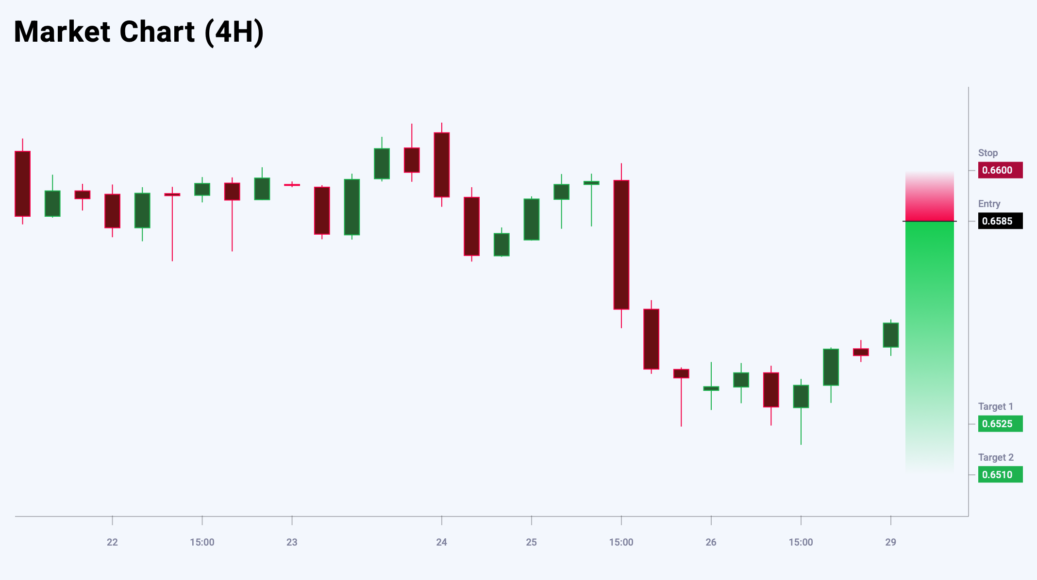 AUDUSD жұбы бойынша орта мерзімді тренд аюлы болып қала береді. Баға артық сатып алынған аймақта орналасқан, бұл қысқа мерзімді түзету мүмкіндігін тудырады. 0.6585 кедергі деңгейіне жақындаған кезде сату ұсынылады. Бүгінгі AUDUSD сауда идеясы Sell Limit күтілетін ордерді қоюды ұсынады.