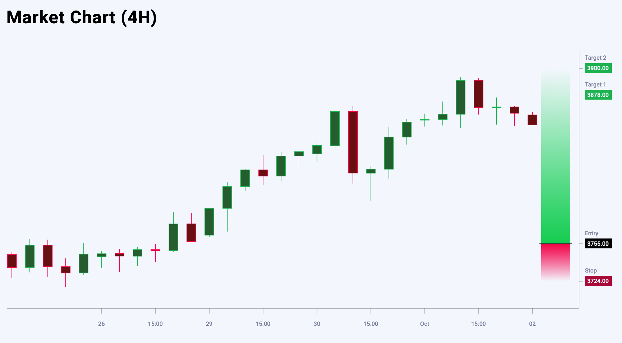 XAUUSD котировкалары арна жоғарғы шекарасынан жоғары көтеріліп, 3891 деңгейінде әлеуетті мақсатты айқындады. Күндік графикте аюлы шам үлгісі қалыптасты, бұл қысқа мерзімді аюлы түзетудің ықтималдығын көрсетеді. Негізгі қолдау деңгейі 3755 белгісінде орналасқан. Бүгінгі XAUUSD сауда идеясы Buy Limit күтілетін ордерді қоюды ұсынады.