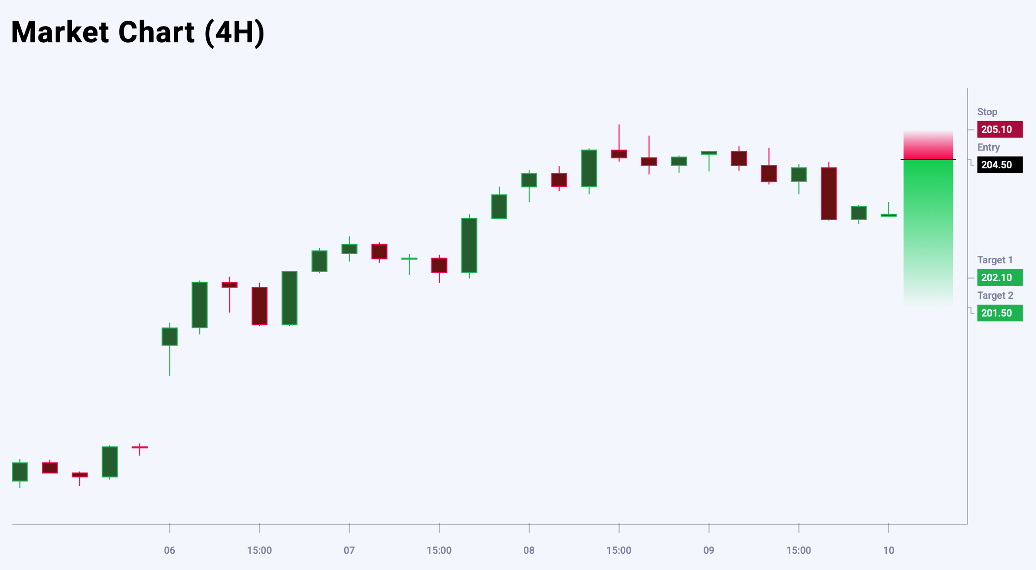 GBPJPY нарығында бұқалар үстемдігін жалғастыруда, алайда өсім серпінінің баяулауы ықтимал кері бұрылуды көрсетеді. Баға құрылымы максимум аймағын қалыптастыруда, және келесі төмендеу толқыны алдында қысқа мерзімді өсім болуы мүмкін. Негізгі стратегия – баға көтерілген кезде сату, ал негізгі қарсылық деңгейі 204.50 белгісінде орналасқан. Ең жақын қолдау деңгейі 201.90 шамасында. Бүгінгі GBPJPY сауда идеясы Sell Limit күтілетін ордерді қоюды ұсынады.
