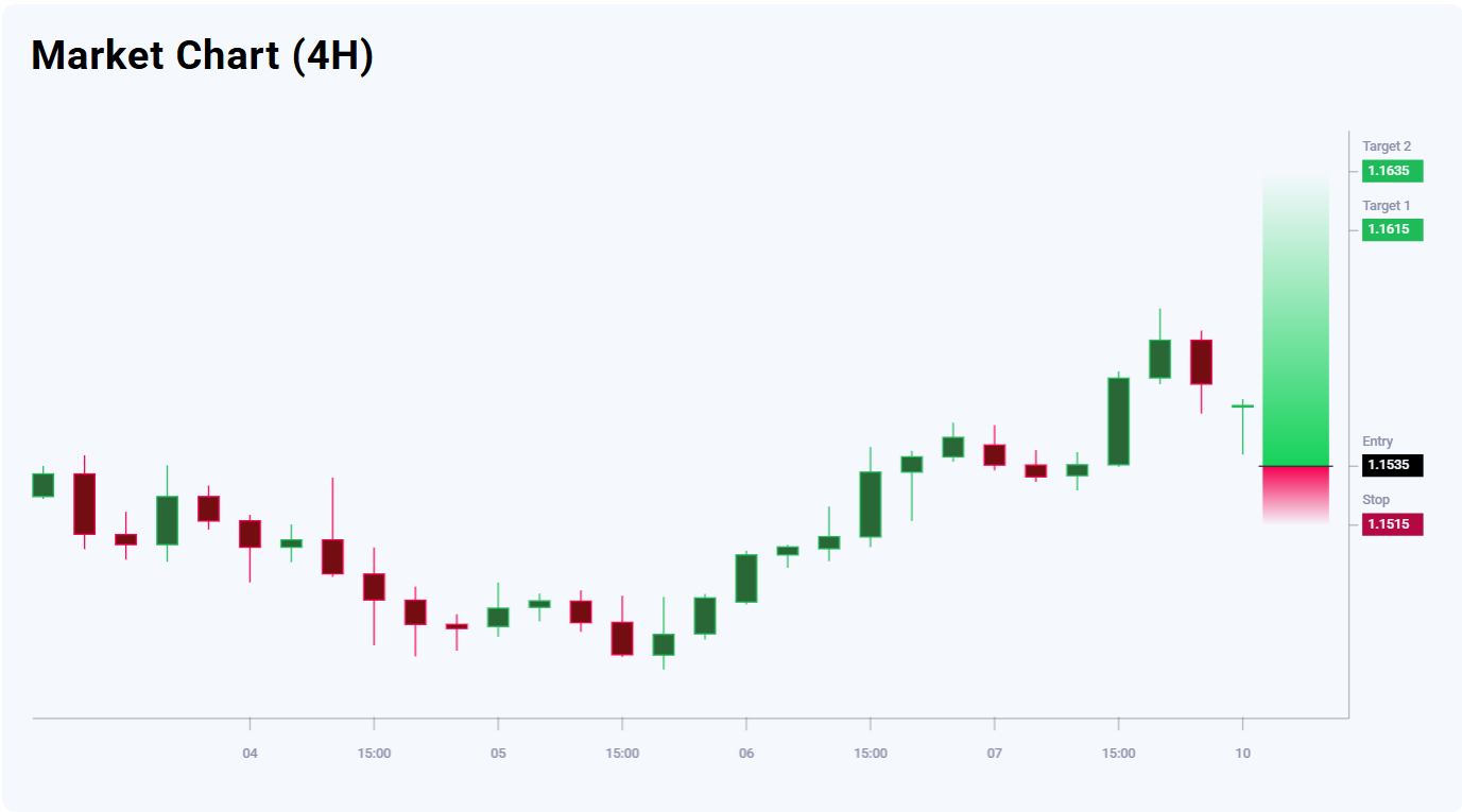 EURUSD жұбының негізгі тренді «бұқа» болып қалуда, қысқа мерзімді RSI индикаторы жоғары бағытта қозғалып, импульстің күшею мүмкіндігін көрсетеді. Негізгі стратегия баға түзетілген кезде сатып алу болып қалады, себебі қазіргі тәуекел мен табыстылық қатынасы дереу кіруге қолайсыз. 1.1555 деңгейінде негізгі қолдау қалыптасты, мұнда сұраныстың қайта күшеюі күтіледі. Бүгінгі EURUSD сауда идеясы күтілетін Buy Limit ордерін орналастыруды ұсынады.