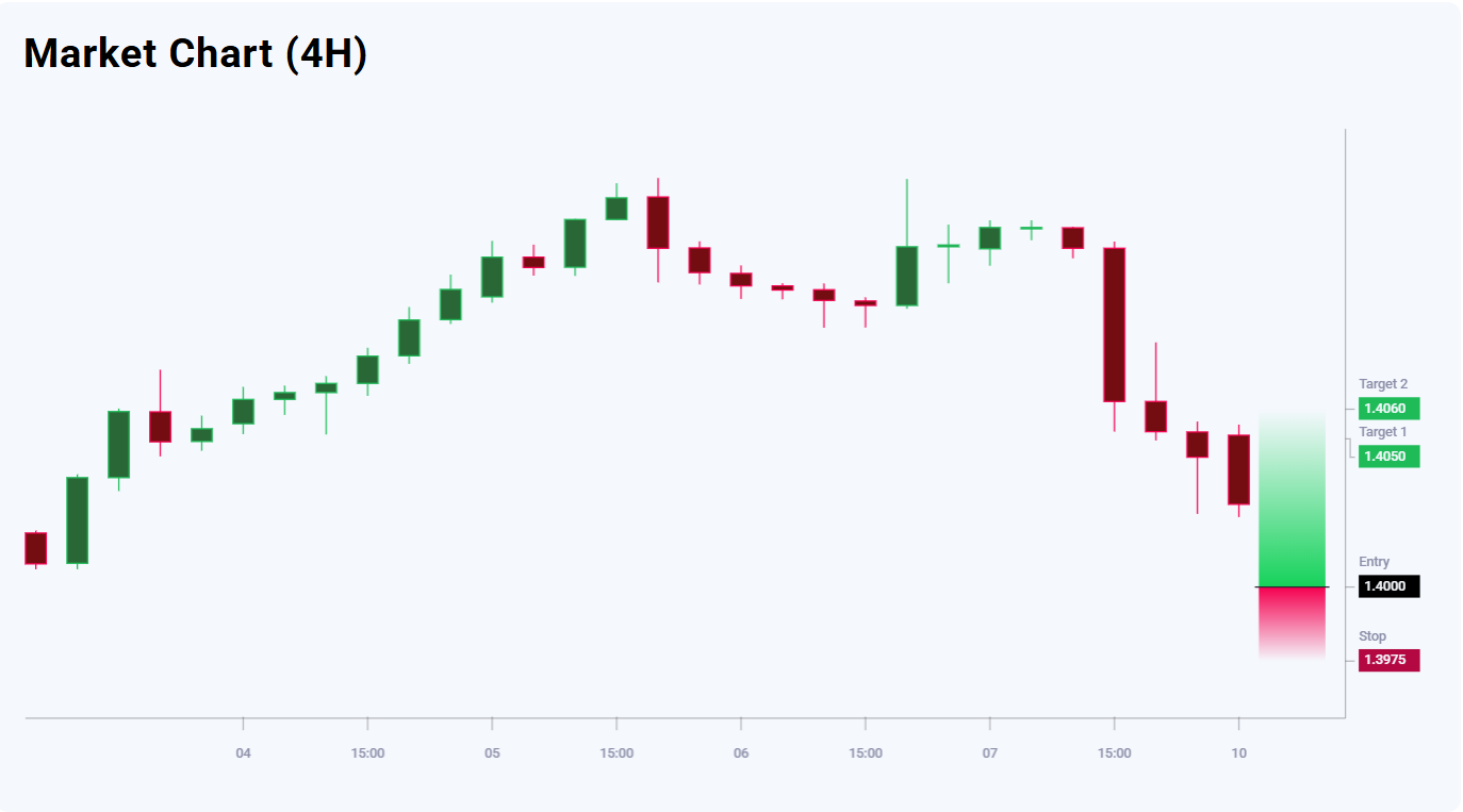 USDCAD жұбының өсу қозғалысының аяқталғанын көрсететін нақты белгілер жоқ. Жалпы тренд «бұқа» болып қалуда, бірақ кең ауқымды өсу арнасын бұзбай төменге қарай түзету болуы мүмкін. Қазіргі тәуекел мен табыстылық қатынасы осы деңгейлерде сатып алуды тартымсыз етеді. 1.4040 деңгейінен жоғары серпіліс өсу импульсін растайды, ал мақсатты деңгей 1.4060 болып табылады. Бүгінгі USDCAD сауда идеясы күтілетін Buy Limit ордерін орналастыруды ұсынады.