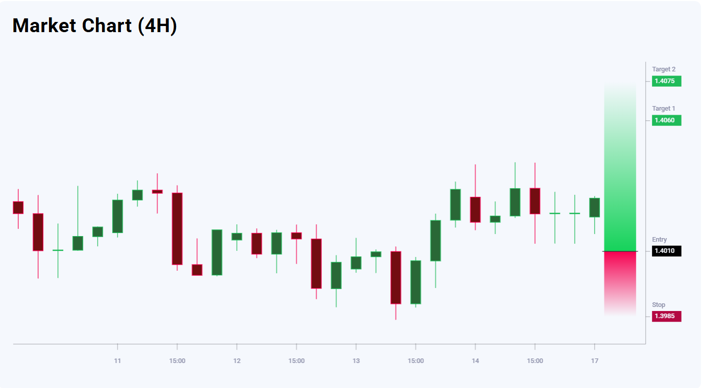 USDCAD жұбының өсу тренді аяқталғанын көрсететін айқын белгілер жоқ. Жалпы перспектива «бұқа» сипатта, дегенмен қысқа мерзімді түзету болуы мүмкін. Сондықтан негізгі стратегия – қысқа Stop-Loss орната отырып, түзетуден кейін сатып алу, өсу импульсінің жалғасуын күту. 1.4040 деңгейінен жоғары серпіліс өсу импульсін растайды. Бүгінгі USDCAD сауда идеясы күтілетін Buy Limit ордерін орналастыруды ұсынады.