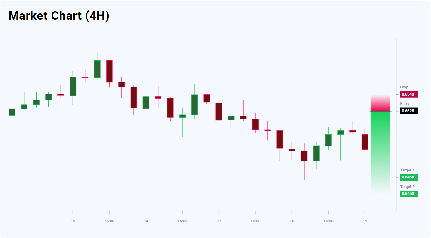 AUDUSD валюталық жұбының орта мерзімді тренді «аюлы» болып қалуда. RSI индикаторы жоғары бағытта қозғалып, уақытша жоғары түзетуді болжайды. Осыған байланысты ұсынылатын стратегия – қысқа Stop-Loss орната отырып, түзетуден кейін сату. Негізгі қарсылық деңгейі 0.6525 деңгейінде орналасқан. Бүгінгі AUDUSD сауда идеясы күтілетін Sell Limit ордерін орналастыруды ұсынады.