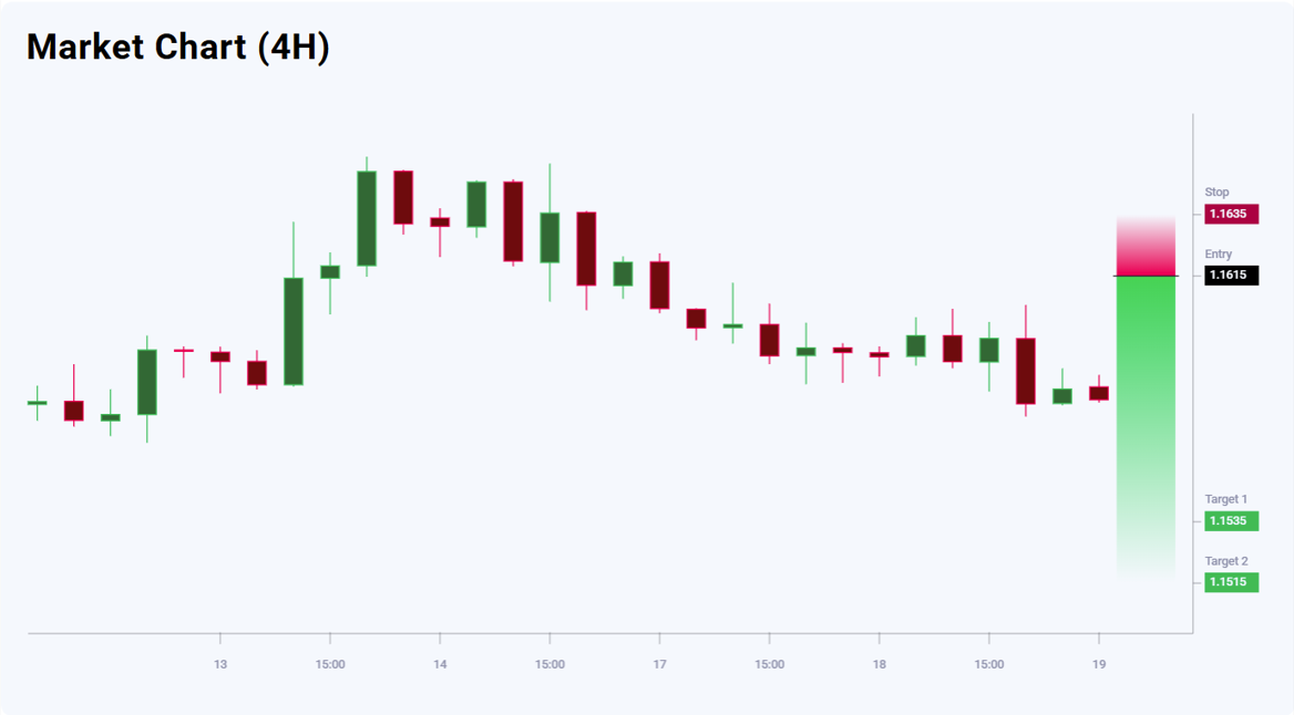 EURUSD валюталық жұбының орта мерзімді негізгі тренді «аюлы» болып қалуда. Қысқа мерзімді RSI индикаторы жоғары бағытта қозғалып, ықтимал түзетуді көрсетеді. Негізгі стратегия – баға түзетілгеннен кейін сату, себебі ағымдағы нарықтық бағамен кіру тәуекел мен табыстылық қатынасы тұрғысынан тиімсіз. 1.1615 деңгейінде негізгі қолдау қалыптасты. Бүгінгі EURUSD сауда идеясы күтілетін Sell Limit ордерін орналастыруды ұсынады.