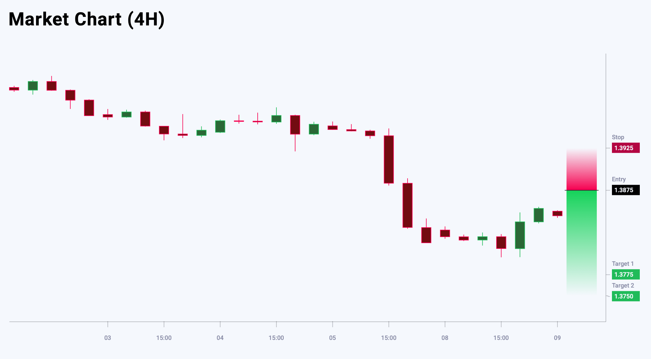 USDCAD жұбында төмендеу үрдісінің аяқталғанына айқын белгілер жоқ. Жалпы аюлы көңіл-күйге қарамастан, қысқа мерзімді түзету жоғары қарай болуы мүмкін, бірақ ол трендті өзгерпейді. Қазіргі деңгейлерде қысқа позиция ашуға тәуекел-пайда қатынасы қолайсыз. 1.3825 деңгейінен төмен бұзу төмендеу импульсін растайды және 1.3750 мақсатқа жол ашады. Бүгінгі USDCAD сауда идеясы Sell Limit ордерін орналастыруды ұсынады.