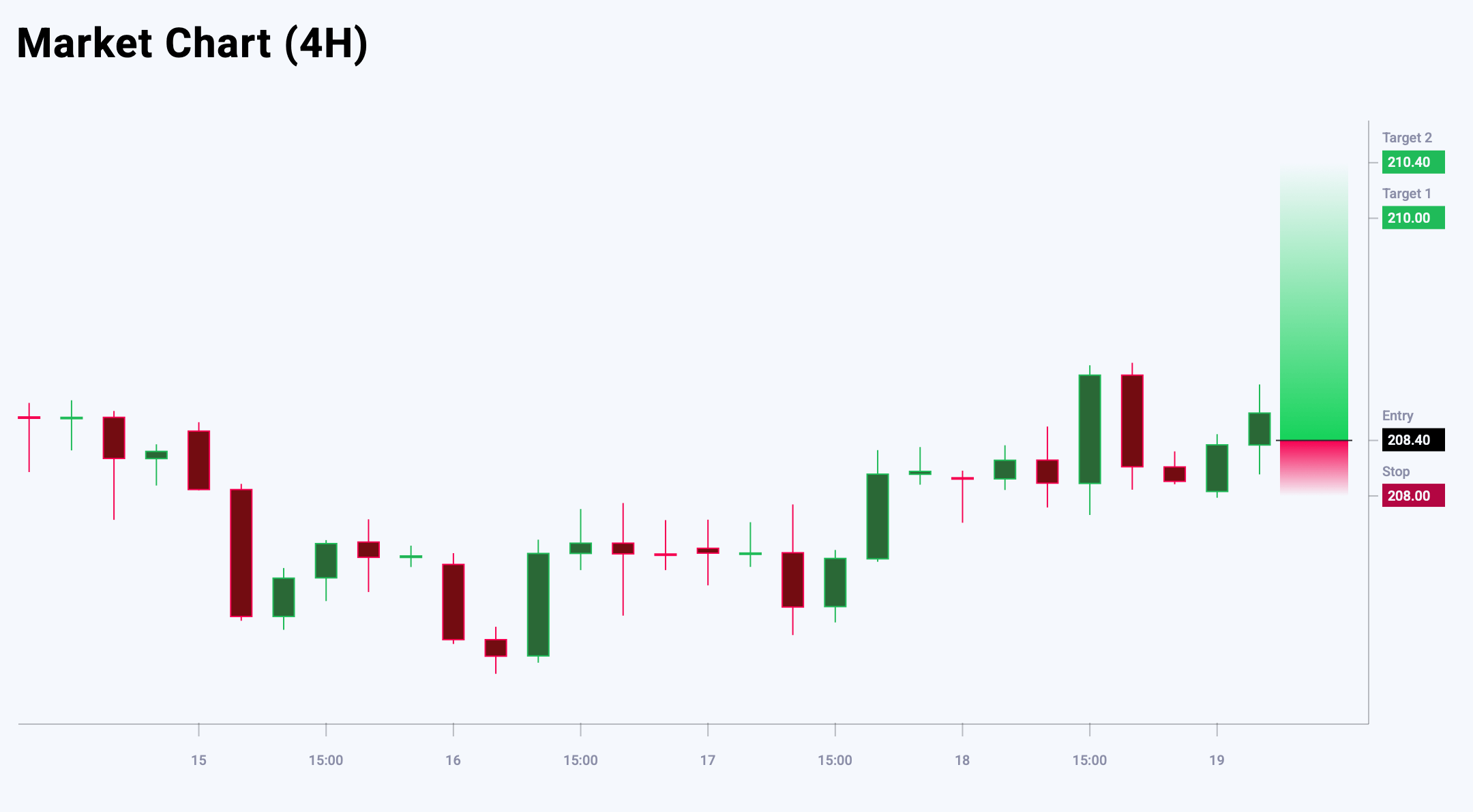 GBPJPY валюталық жұбы бойынша негізгі тренд «бұқалы» күйінде қалып отыр. Ағымдағы деңгейлерде түзету қаупінің жоғары болуы ұзын позициялар ашуды тартымсыз етеді. Оңтайлы стратегия — түзетулер кезінде сатып алу. Негізгі қолдау деңгейі 208.40 аймағында орналасқан. Қазіргі уақытта нарық артық сатып алынған аймақта тұр. Бүгінгі GBPJPY сауда идеясы Buy Limit ордерін орналастыруды ұсынады.