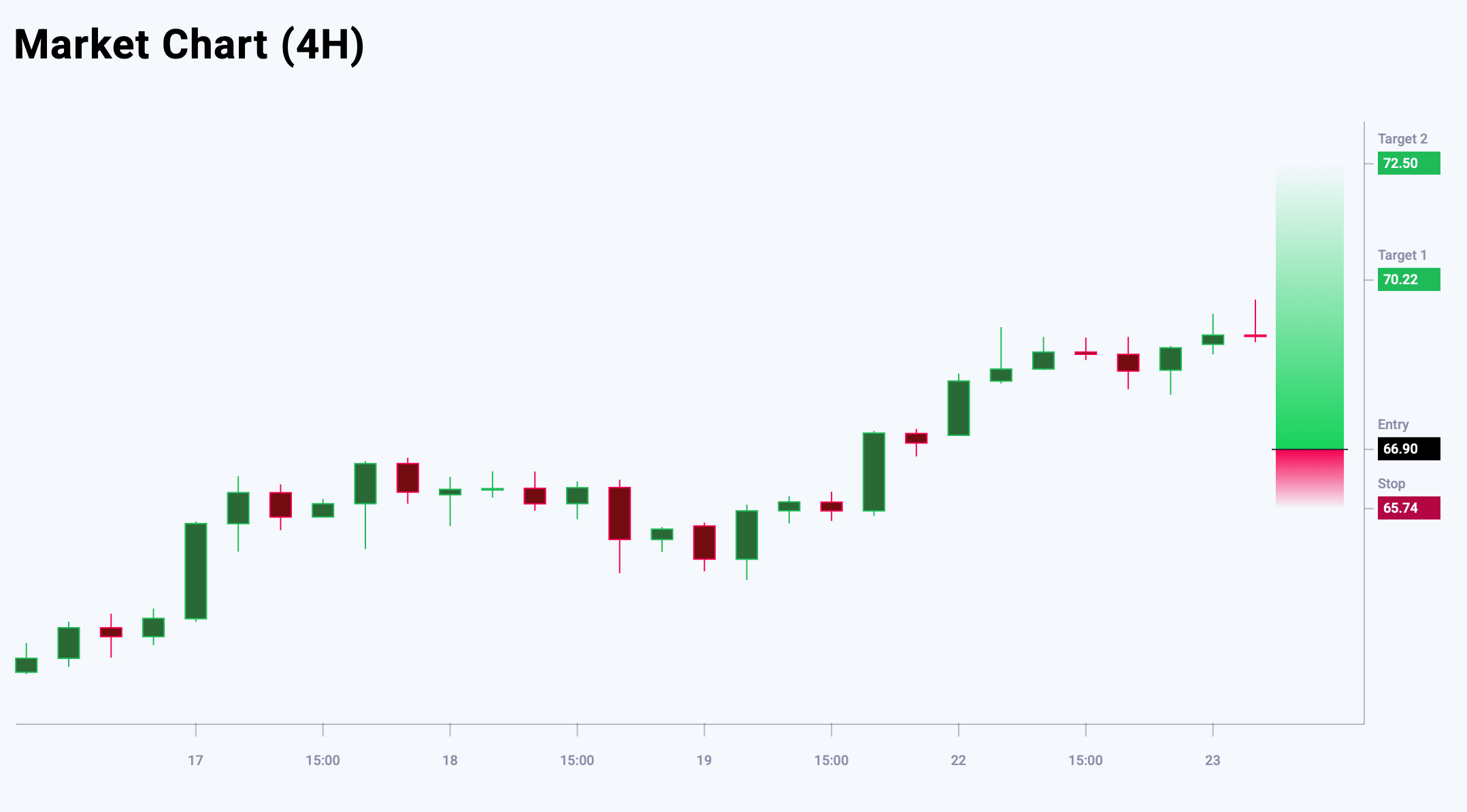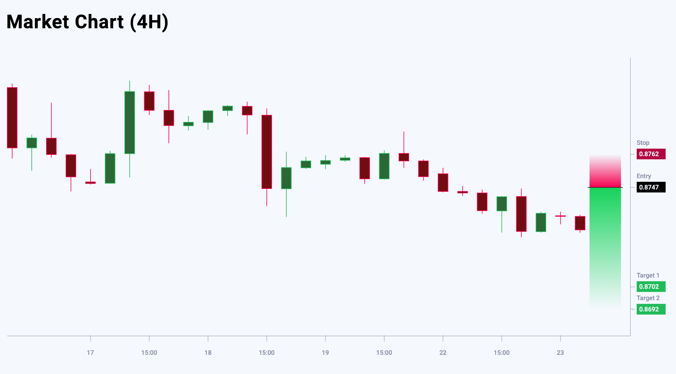 EURGBP бойынша нарықтық көңіл-күй «бұқалы» күтулердің басымдығын көрсетеді — 55% vs 45%. Тәуекел мен максималды табыс қатынасы 1:3-тен жоғары. Бірінші тейк-профит деңгейіне жеткендегі әлеуетті табыс 45 пункт, екіншісінде — 55 пункт, ал ықтимал шығындар 15 пунктпен шектеледі.