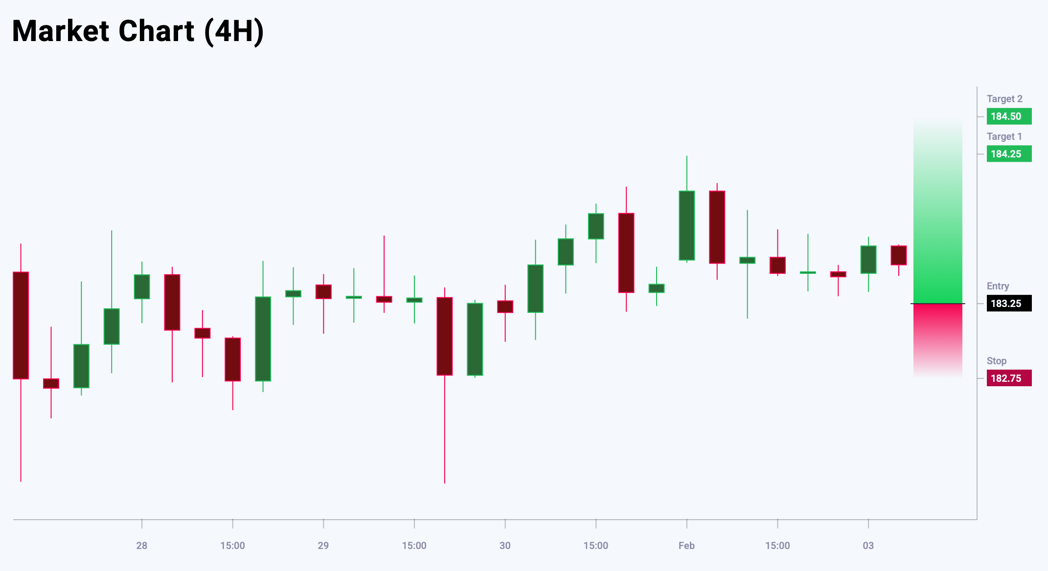 EURJPY жұбының ішкі күндік графигінде баға бүйірлік консолидацияны қалыптастыруда. Ең жақын қолдау деңгейі 182.50 аймағында орналасқан; алайда ағымдағы деңгейлерде ұзын позициялар ашу тәуекел/пайда арақатынасы тұрғысынан тартымсыз. 183.75 деңгейінен жоғары бұзылу бұқалық импульстің қайта жандануын растайды, келесі мақсат 184.50 деңгейінде орналасқан. Бүгінгі EURJPY сауда идеясы күтілетін Sell Limit ордерін орналастыруды ұсынады.