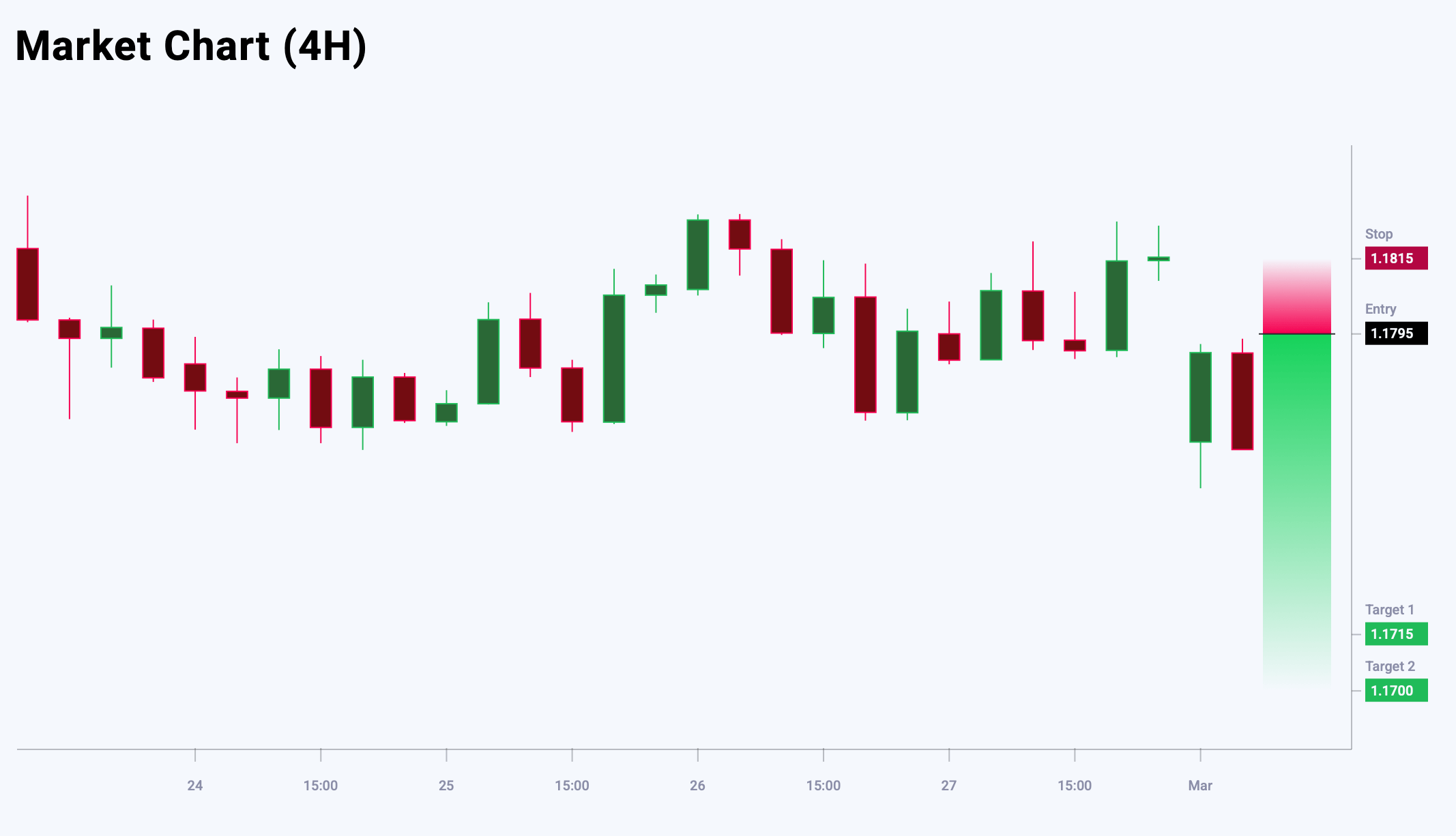 EURUSD жұбында орта мерзімді тренд аюлы болып қала береді. Төмендеу импульсінің аяқталуына қатысты белгілер жоқ. Ағымдағы деңгейлерде қысқа позициялар ашу тәуекел/табыстылық арақатынасы тұрғысынан тартымсыз көрінеді. Басым стратегия – кері шегіністер кезінде сату. Негізгі қарсылық деңгейі 1.1795 аймағында орналасқан. Бүгінгі EURUSD сауда идеясы кейінге қалдырылған Sell Limit ордерін орналастыруды көздейді.