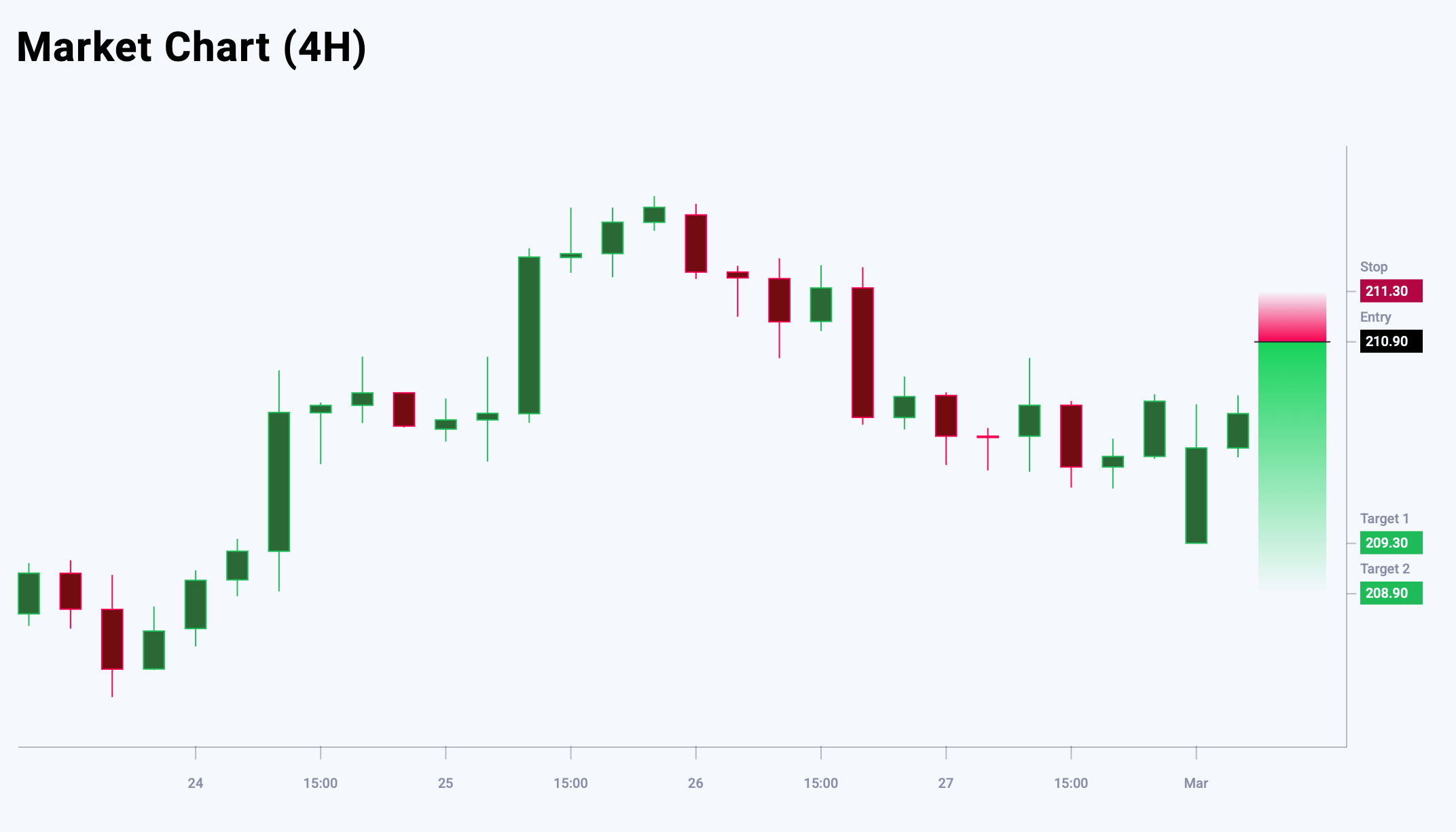 GBPJPY жұбында орта мерзімді тренд аюлы болып қала береді. Қысқа мерзімді RSI өсіп жатыр, бұл ықтимал қысқа мерзімді қалпына келуді және бычий коррекцияны көрсетеді. Басым стратегия – баға өскен кезде сату. Ағымдағы деңгейлерде қысқа позициялар ашу тәуекел/табыстылық арақатынасы тұрғысынан тартымсыз көрінеді. Негізгі қарсылық деңгейі 210.90 аймағында орналасқан. Бүгінгі GBPJPY сауда идеясы кейінге қалдырылған Buy Limit ордерін орналастыруды көздейді.