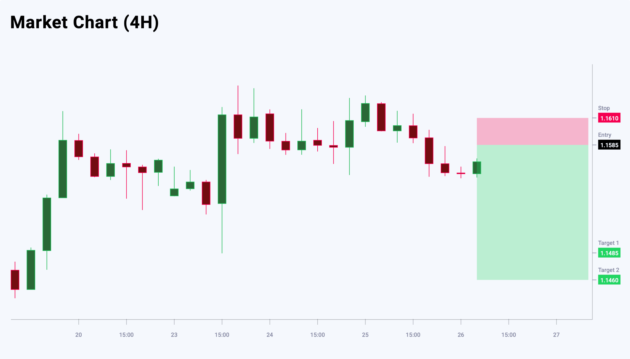 EURUSD валюта жұбы аюлы трендті сақтауда. Ағымдағы баға динамикасы жергілікті шыңның қалыптасуын көрсетеді, бұл негізгі тренд аясында қайта төмендеу ықтималдығын арттырады. Дегенмен, ағымдағы деңгейлерде қысқа позициялар ашу үшін тәуекел/табыстылық арақатынасы қолайсыз болып қалып отыр, бұл алдымен бычий түзету болмайынша сатуды шектейді. Негізгі стратегия – өсім кезінде сату мүмкіндіктерін іздеу. Негізгі қарсылық аймағы 1.1585 деңгейінде орналасқан, мұнда сатушылар қысымы күшеюі күтіледі. Бүгінгі EURUSD сауда идеясы кейінге қалдырылған Sell Limit ордерін орналастыруды көздейді.