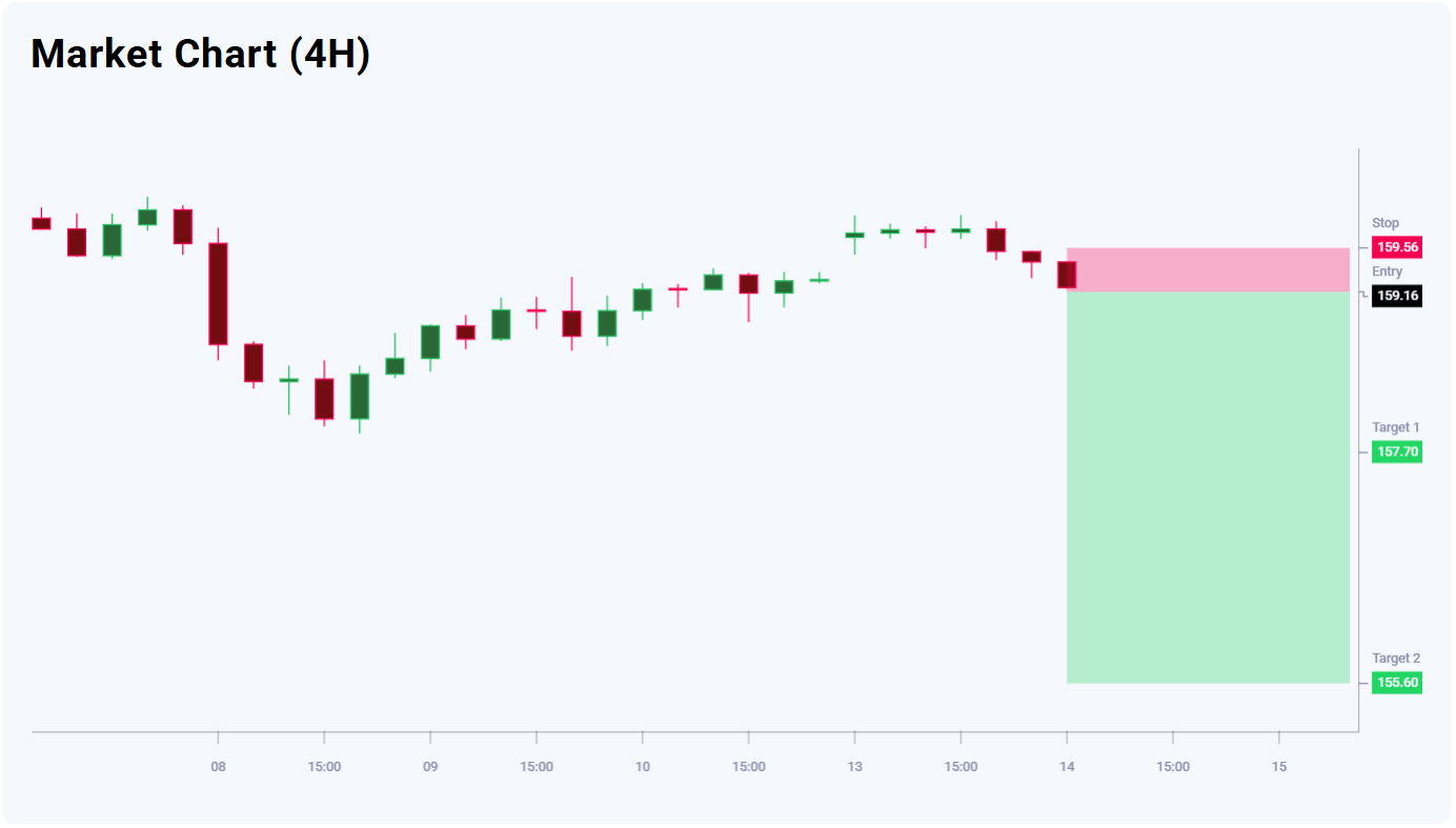 USDJPY бойынша жаңалықтық фон бейтарап – 50% қарсы 50%. Мәміле тәуекел/табыс арақатынасы тұрғысынан тартымды көрінеді. 157.70 деңгейіндегі бірінші мақсат 146 пипс пайда әлеуетін ұсынады, ал 155.60 деңгейіндегі екінші мақсат 356 пипске дейін ұлғайтады. 159.56 деңгейіндегі stop-loss тәуекелді 40 пипспен шектейді, бұл бірінші мақсат үшін 1:3-тен жоғары және екінші мақсат үшін 1:8 тәуекел/табыс қатынасын береді.