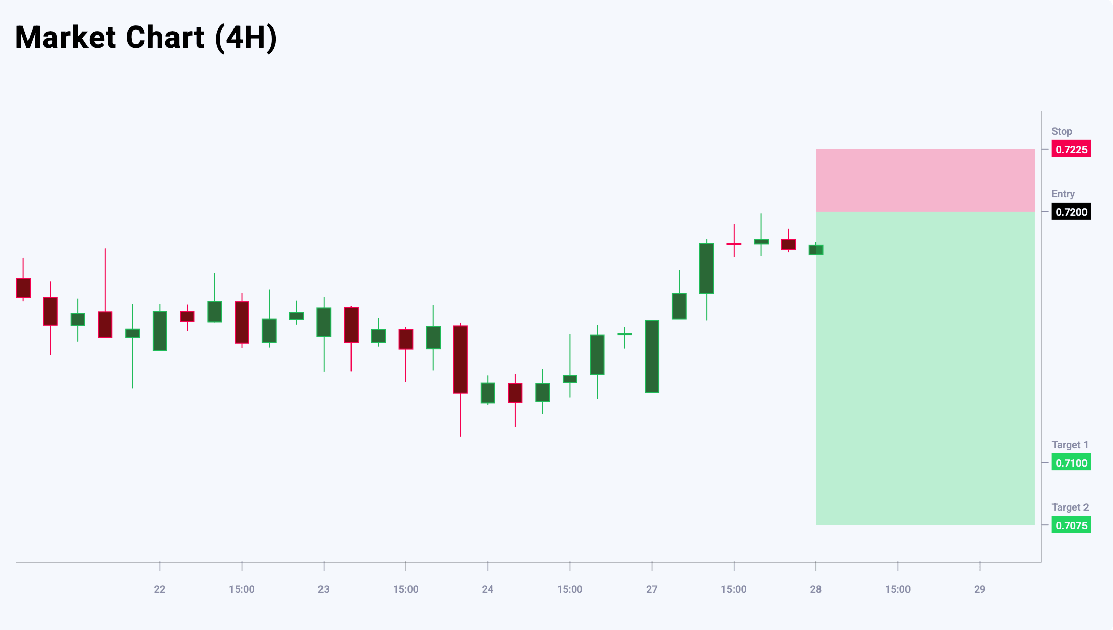 AUDUSD жұбында сатып алушылар бақылауды сақтап отыр, алайда өсу импульсінің әлсіреуі ықтимал кері бұрылу моделін білдіреді. Қысқа мерзімде жұп өсуді жалғастыруға тырысуы мүмкін, бірақ ағымдағы баға динамикасы жергілікті шыңның қалыптасу белгілерін көрсетуде. Осы жағдайда негізгі сценарий — өсулерде сату мүмкіндіктерін іздеу. Негізгі қарсылық деңгейі 0.7200 аймағында шоғырланған, мұнда сатушылар қысымы күшеюі ықтимал. Бүгінгі AUDUSD сауда идеясы кейінге қалдырылған Sell Limit ордерін орналастыруды ұсынады.