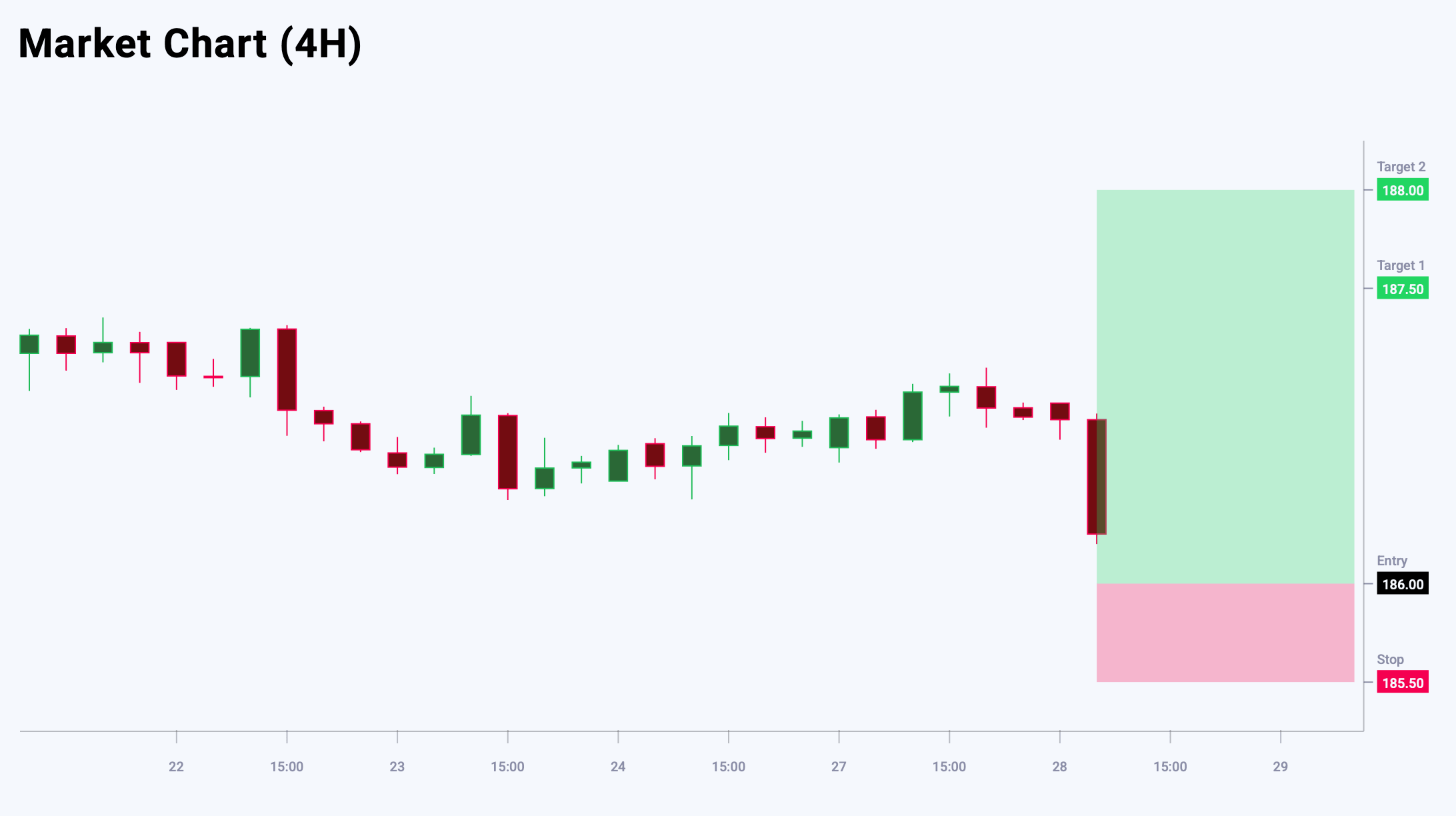 EURJPY валюталық жұбы жергілікті аюлы түзетуге қарамастан, өсу қозғалысының аяқталғанын көрсететін нақты сигналдарсыз қалып отыр, бұл орта мерзімді перспективада бычий импульстің сақталғанын білдіреді. Жалпы оң нарықтық көңіл-күй сақталуда, дегенмен түзетудің жалғасу ықтималдығы әлі де жоғары. Қазіргі деңгейлерде long позицияларды ашу тәуекел/табыс тұрғысынан тиімсіз, сондықтан сатып алу тартымсыз көрінеді. 186.50 деңгейінен жоғары сенімді бекіту бычий импульстің күшеюін растап, 188.00 аймағына қарай өсімге жол ашады. Бүгінгі EURJPY сауда идеясы кейінге қалдырылған Buy Limit ордерін орналастыруды ұсынады.