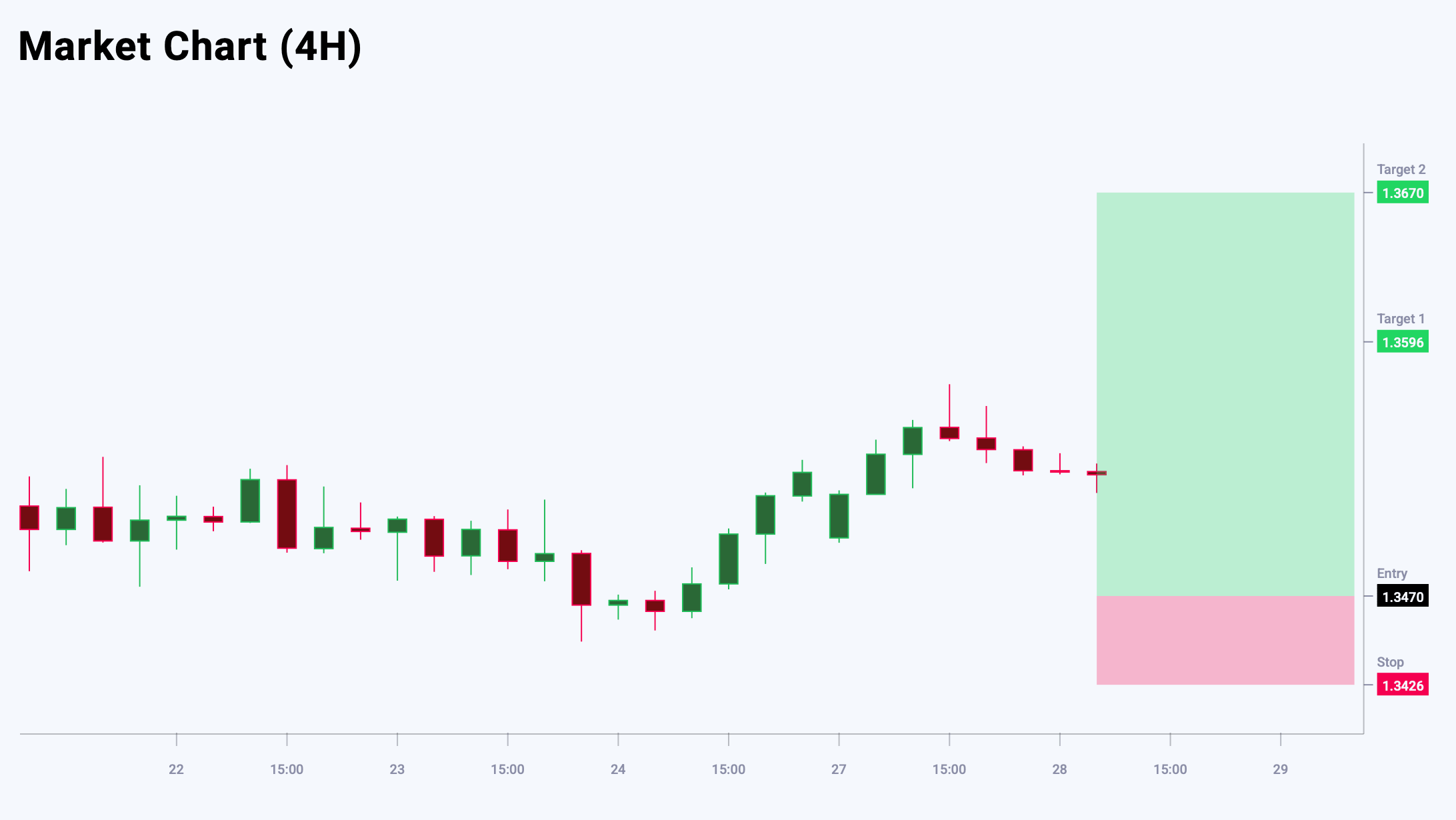 1.3576 қарсылық деңгейі GBPUSD өсімін тежеді, содан кейін сатушылар қысымының күшеюі бағаның кері бұрылуына және төмендеуіне әкелді. Ағымдағы төмендеу қысқа мерзімде жалғасуы мүмкін, дегенмен жалпы тренд жоғары бағытта қалып отыр, ал түзетуші өсулер шектеулі болады. Осы жағдайда негізгі стратегия — төмендеулерде сатып алу мүмкіндіктерін іздеу, қысқа stop-loss қолдану арқылы трендтің қайта жалғасуын есепке алу. Негізгі қолдау деңгейі 1.3470 аймағында орналасқан, онда сатып алушылар белсенділігі артуы мүмкін. Бүгінгі GBPUSD сауда идеясы кейінге қалдырылған Buy Limit ордерін орналастыруды ұсынады.