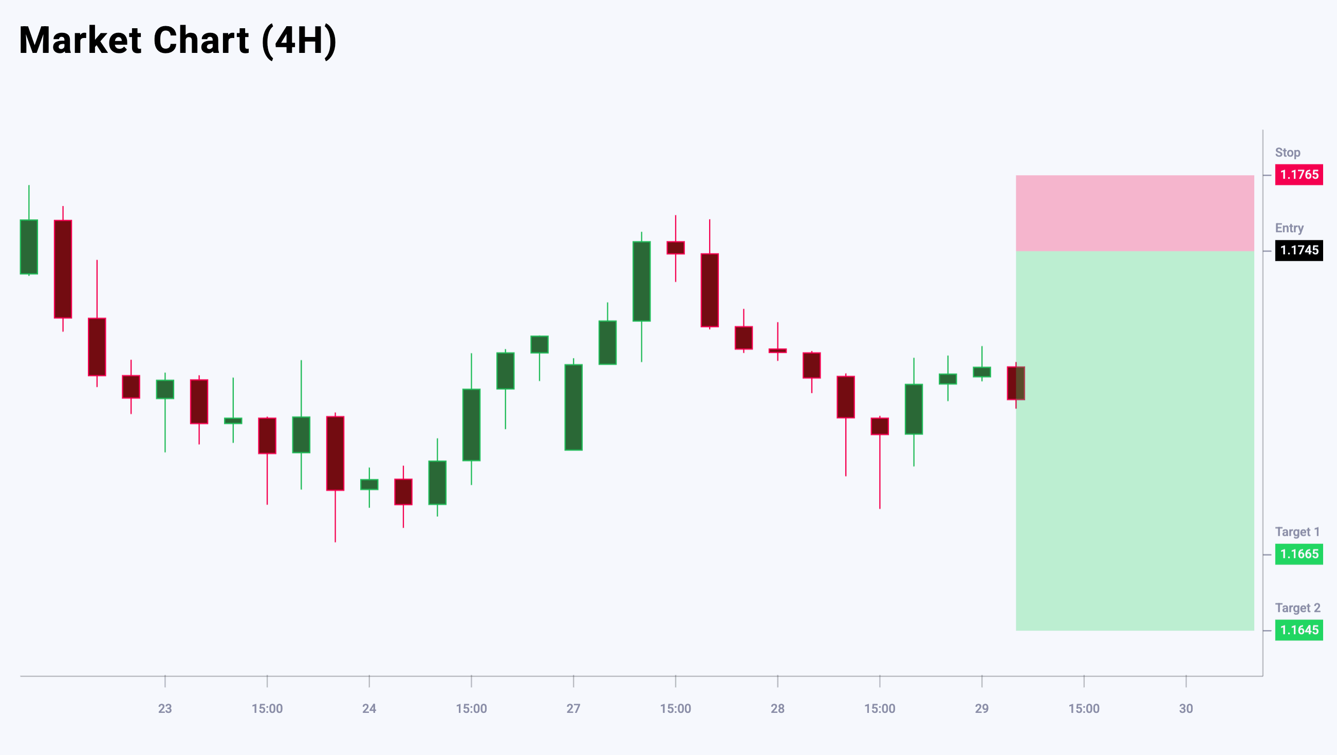 EURUSD жұбының орта мерзімді тренді аюлы болып қалып отыр. RSI индикаторы тұрақты түрде төмендеп, сатушылар қысымының сақталғанын көрсетеді. Сонымен қатар, қазіргі деңгейлерде қысқа позициялар ашу тәуекел/табыс тұрғысынан ең тиімді шешім емес. Осы жағдайда негізгі стратегия — кері өсулерде сату. Негізгі қарсылық аймағы 1.1745 деңгейінде орналасқан, мұнда сатушылар қысымы күшеюі және аюлы импульс қайта жандануы мүмкін. Бүгінгі EURUSD сауда идеясы кейінге қалдырылған Sell Limit ордерін орналастыруды ұсынады.