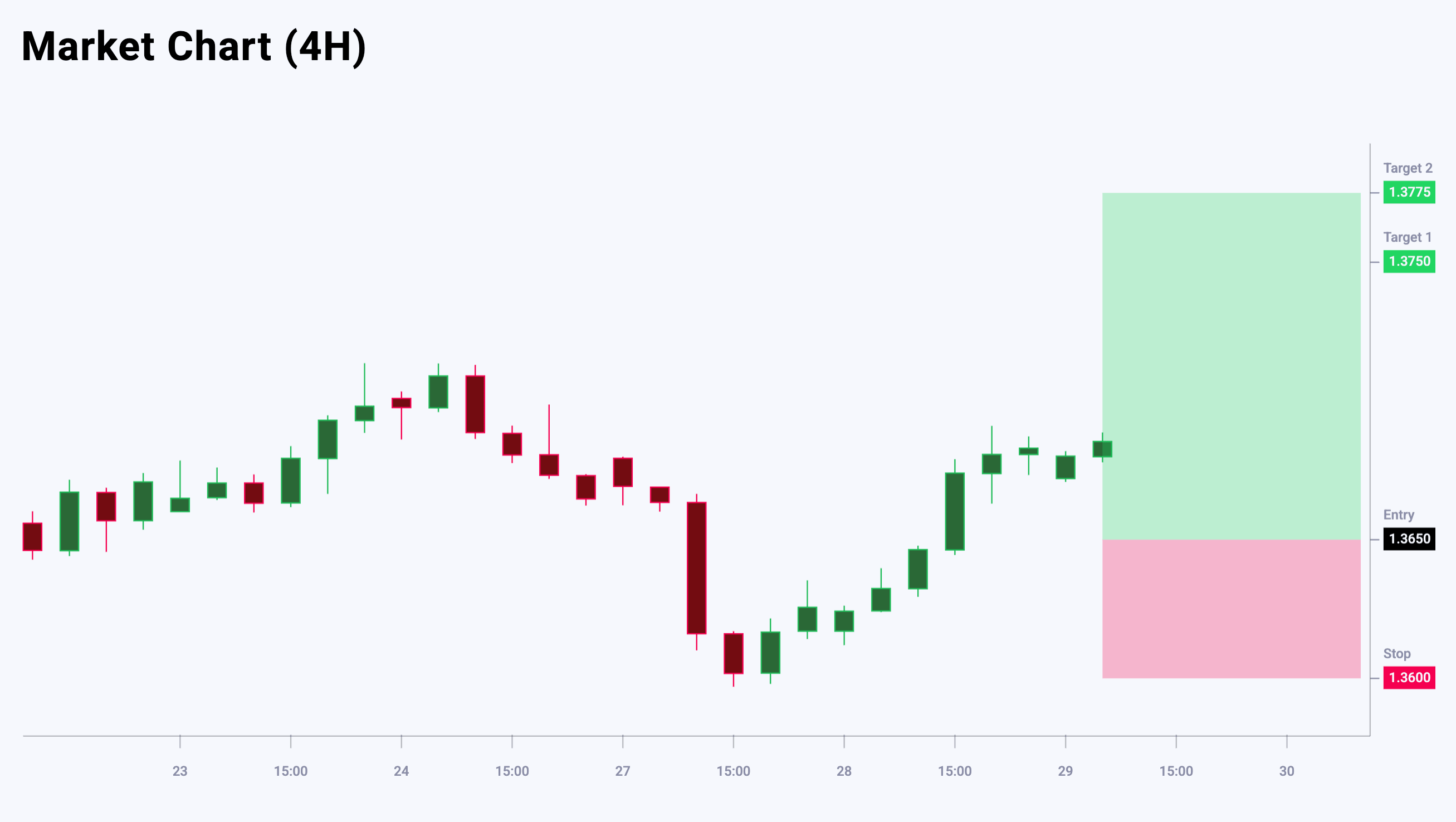 USDCAD жұбының төмендеуі ағымдағы түзетудің аяқталуға жақын екенін көрсетеді. Осы жағдайда нарық ықтимал кері бұрылу және бычий импульстің қалыптасу белгілерін көрсете бастады. Алайда қазіргі деңгейлерде long позицияларды ашу тәуекел/табыс тұрғысынан аса тартымды емес. 1.3675 қарсылық деңгейінен жоғары бұзылу өсімнің жалғасуын растайды. Бұл жағдайда баға 1.3775 мақсатымен жоғары қозғалысты жалғастыруы мүмкін. Бүгінгі USDCAD сауда идеясы кейінге қалдырылған Buy Limit ордерін орналастыруды ұсынады.