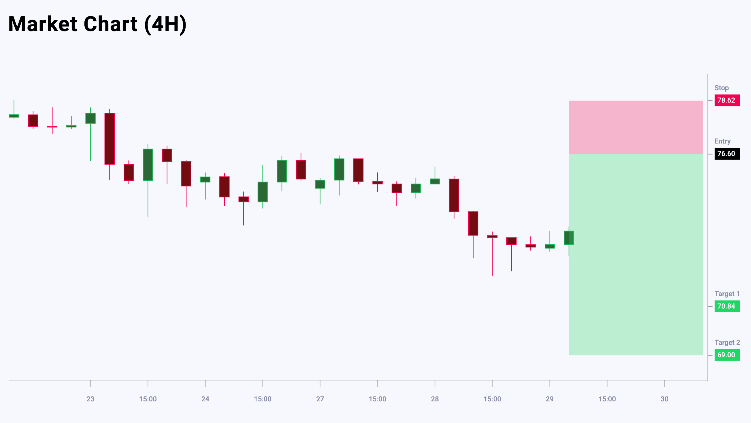 XAGUSD бағалары жергілікті түбін қалыптастырып жатқанға ұқсайды, әрі кері бұрылу шам үлгісі пайда болды. Бұл төмендеуден кейінгі нарықтағы белгісіздікті көрсетеді және аюлы импульстің әлсіреуін білдіруі мүмкін. Нәтижесінде қысқа мерзімді бычий түзету ықтимал, бірақ оның өсу әлеуеті шектеулі болып көрінеді. Қосымша қысым Ichimoku бұлтынан келеді, ол күшті қарсылық ретінде әрекет етіп, әрі қарай өсуді тежейді. Осы жағдайда жоғары қозғалыстарда сатуды қарастыру орынды. Бүгінгі XAGUSD сауда идеясы кейінге қалдырылған Sell Limit ордерін орналастыруды ұсынады.