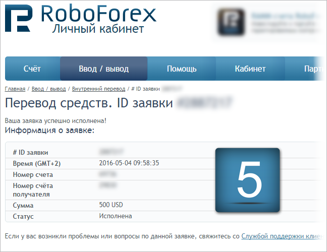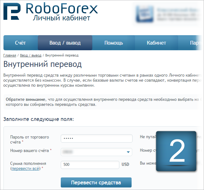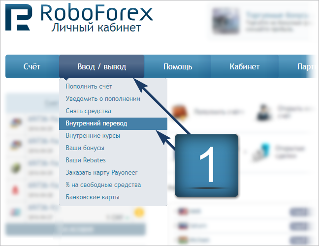 RoboForex клиенттері бір Жеке кабинет аясында барлық сауда шот түрлері арасында комиссиясыз ішкі қаражат аударуды жүзеге асыра алады. Валютасы әртүрлі шоттар арасындағы ішкі аударым қаражат алушы шотындағы салым валютасына ішкі RoboForex бағамдары бойынша айырбастау арқылы жүзеге асырылады.