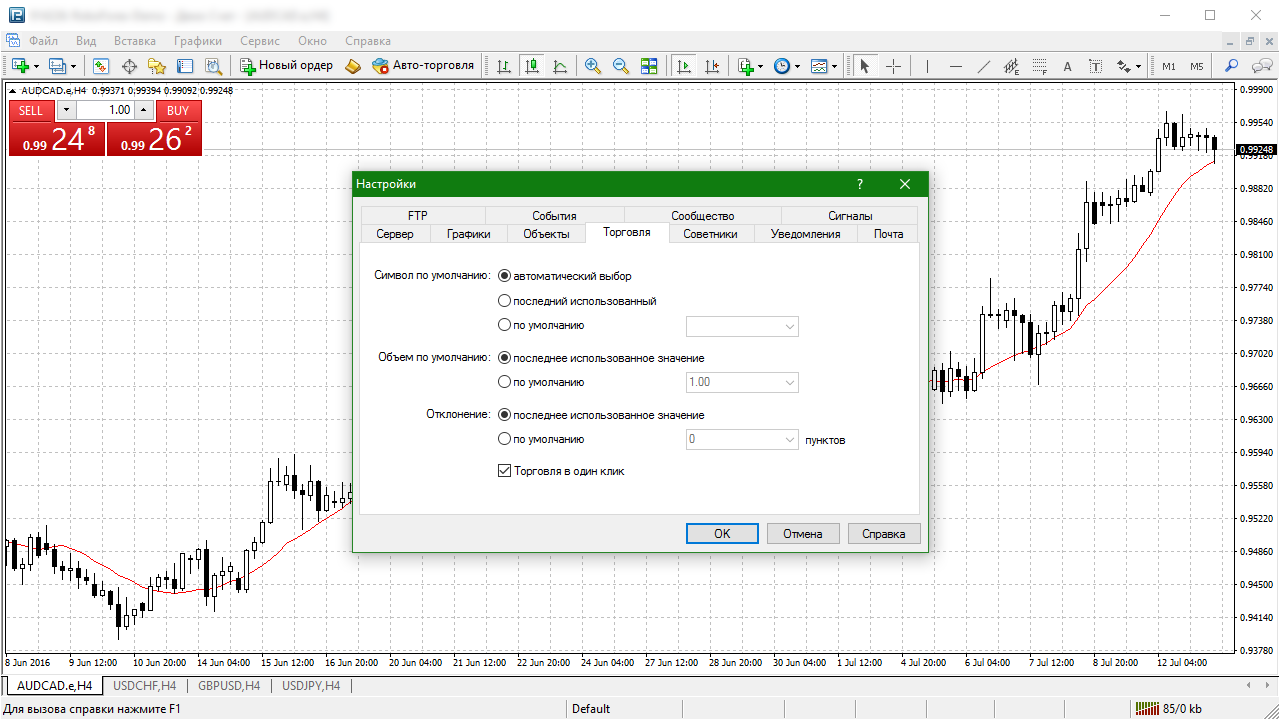Данный сервис по достоинству оценят трейдеры, чья стратегия направлена на совершение большого количества сделок. Достаточно один раз ввести параметры в "One-Click Trading", и вы сможете открывать и закрывать ордера одним нажатием кнопки мыши!